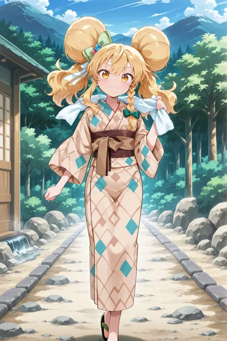 kirisame marisa, 1girl, solo, yellow eyes, blonde hair, double hair bun, single braid, small breasts,, kirisame marisa \(hot spring-obsessed magician\), alternate costume, alternate hairstyle, hair bow, green bow, hair ribbon, white ribbon, hair ornament, towel around neck, yukata, light brown kimono, brown sash, print kimono, square print, sandals,