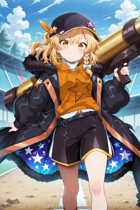 kirisame marisa, 1girl, solo, yellow eyes, blonde hair, short hair, ponytail, single braid, small breasts,, kirisame marisa \(lunar war enchanter\), alternate costume, alternate hairstyle, baseball cap, black cap, hat ornament, layered clothes, black coat, open coat, fur trim, long sleeves, zipper, orange hoodie, hood down, print hoodie, star print, white shirt, turtleneck, orange belt, black belt, black shorts, orange socks, black shoes, sneakers, holding cannon,
