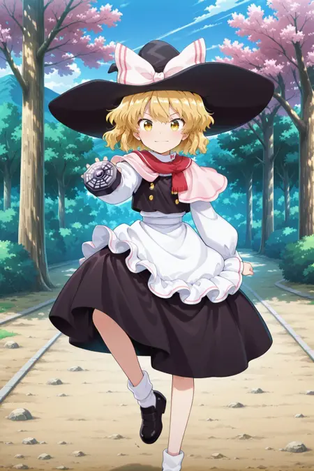 kirisame marisa, 1girl, solo, yellow eyes, blonde hair, short hair,, kirisame marisa \(cherry blossom-love\), alternate costume, witch hat, black hat, hat bow, white bow, red scarf, pink capelet, black vest, white shirt, long sleeves, white apron, waist apron, black skirt, white socks, mini-hakkero,