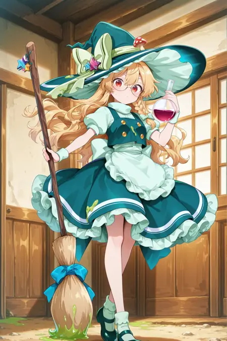 kirisame marisa, 1girl, solo, red eyes, blonde hair, long hair, single braid, small breasts,, kirisame marisa \(star shower night magician\), alternate costume, glassess, witch hat, green hat, hair ribbon, light green ribbon, hat bow, yellow bow, mushroom hat ornament, green vest, buttons, light green shirt, puffy short sleeves, light green wrist cuffs, waist apron, green skirt, frilled skirt, back bow, light green bow, light green socks, mary janes, green shoes, ambiguous green liquid, holding broom, holding flask,