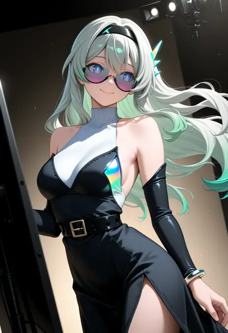 F1reflyJourney, 蓝色瞳孔, 紫色眼睛, 蓝色眼睛, 灰色头发, 绿色头发, 多彩头发, 长发, 黑色发带, 悬浮头饰, 全息头饰, 染色眼镜, 白色吊带, 纹理吊带, 黑色连衣裙, 黑色腰带, 分离袖子, 手链, 侧开衩
