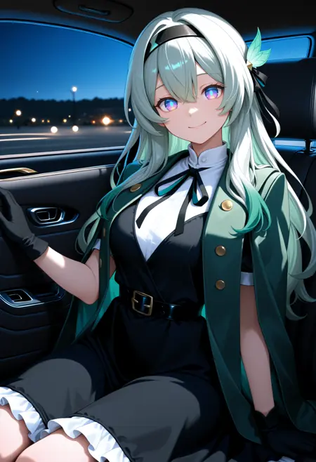 F1reflyJpll, 蓝色瞳孔, 紫色眼睛, 蓝色眼睛, 灰色头发, 绿色头发, 多彩头发, 长发, 黑色发带, 头饰, 黑色连衣裙, 荷叶边连衣裙, 白色衬衫, 黑色丝带, 绿色夹克, 夹克搭在肩膀上, 黑色手套, 黑色腰带, 荷叶边连衣裙