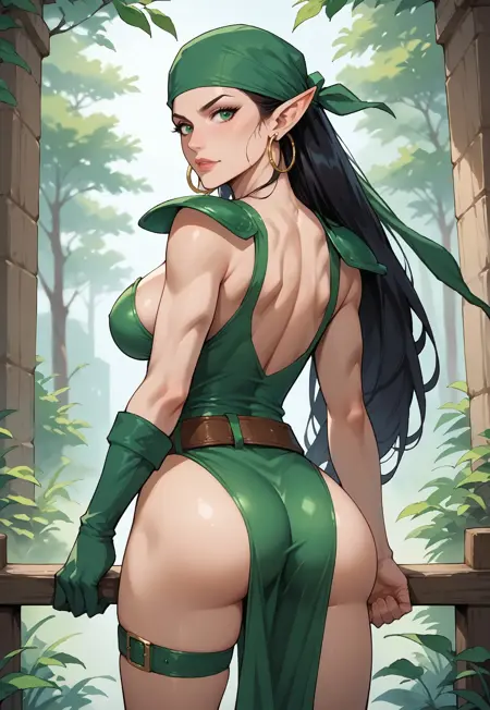 服装——绿色头巾、圆环耳环、紧身衣、胸露、肩甲、单臂手套、腰带、胯部帘布、大腿绑带、大腿长靴,