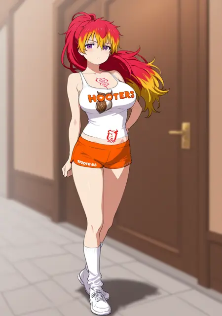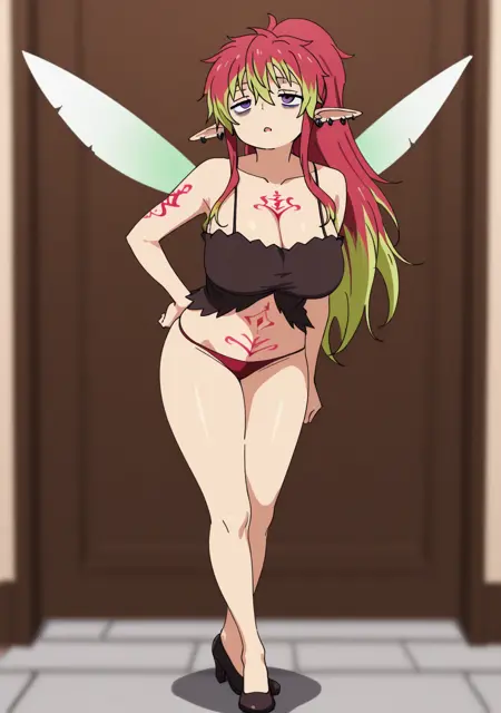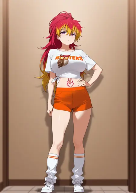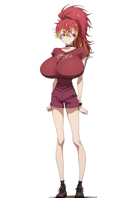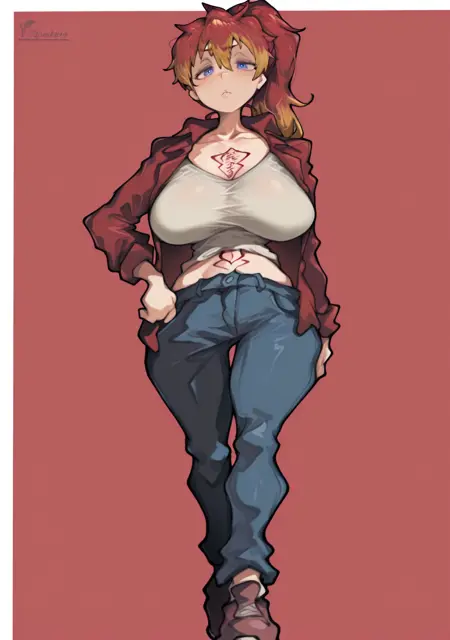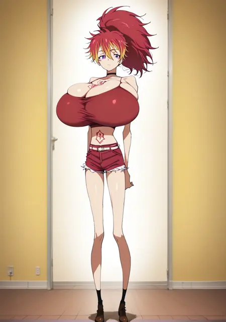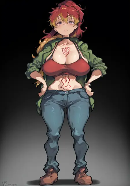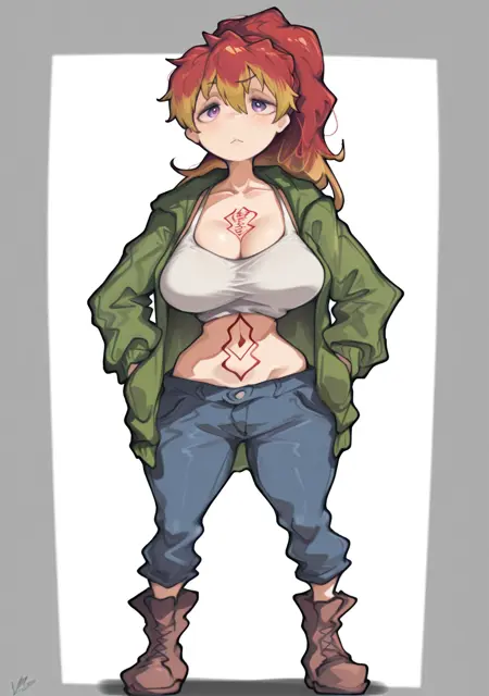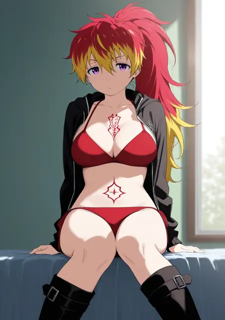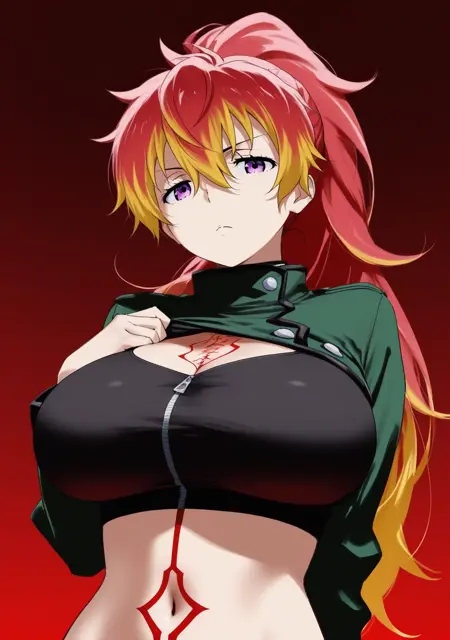 프롬프트: 시우라 키리가쿠레, 보라색 눈, 큰 가슴, 염색한 머리, 다채로운 머리색, 가슴 문신, 복부 문신, 노랑과 빨강 머리, 다채로운 머리색,