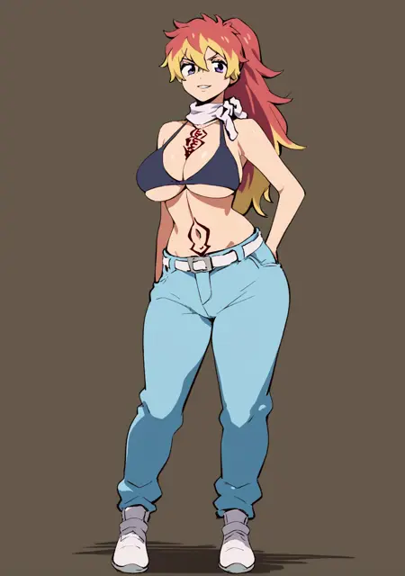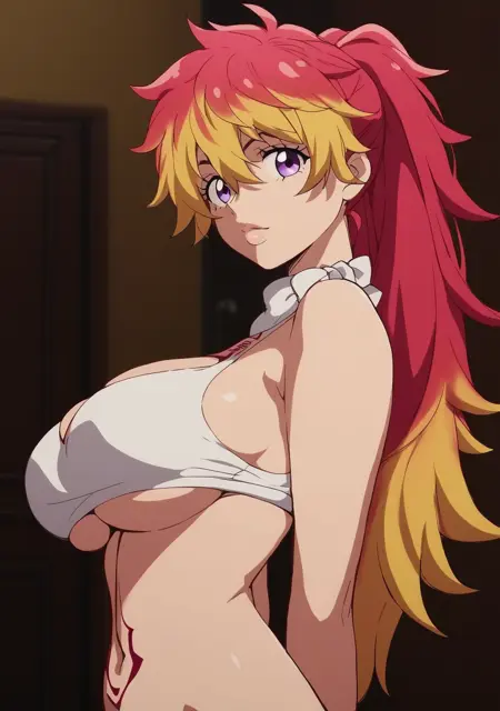 Prompts: shura kirigakure, purple eyes, large breasts, dyed hair, multicolor hair, tattoo on chest, tattoo on stomach, yellow and red hair, multicolored hair,