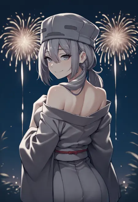 外見: 長い髪、灰色の髪、目の間に髪、低いツインテール、灰色の目、大きな胸