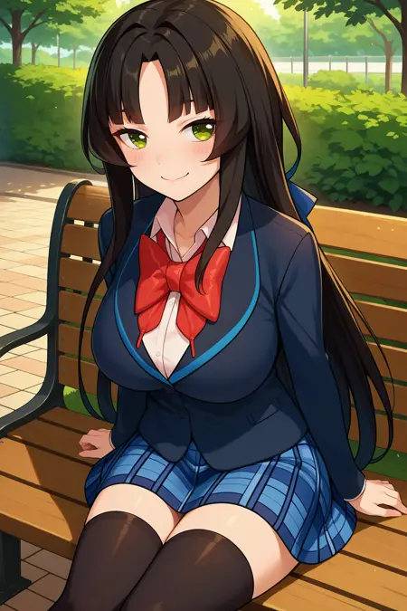 添加 "黑色西装外套,红色领结,有领衬衫,格子裙,黑色过膝袜" 以获得她的校服。