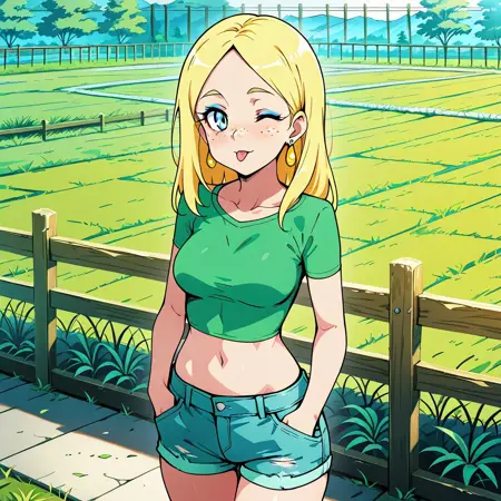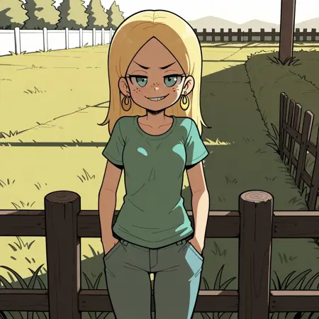 becca_c, blonde hair, earrings, freckles, shirt, pants