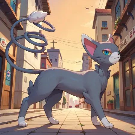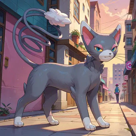 Cat, pokemon, gray and white fur, black nose, pink eyelids, blue eyes, yellow sclera, whiskers,