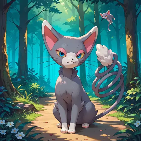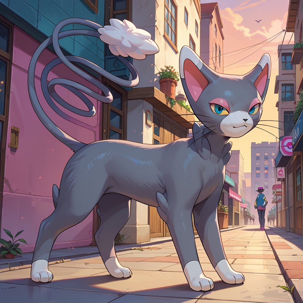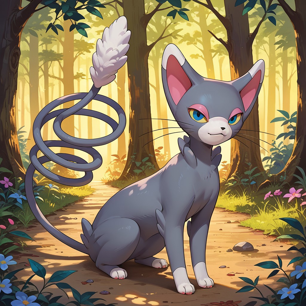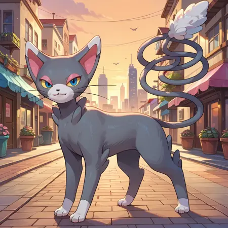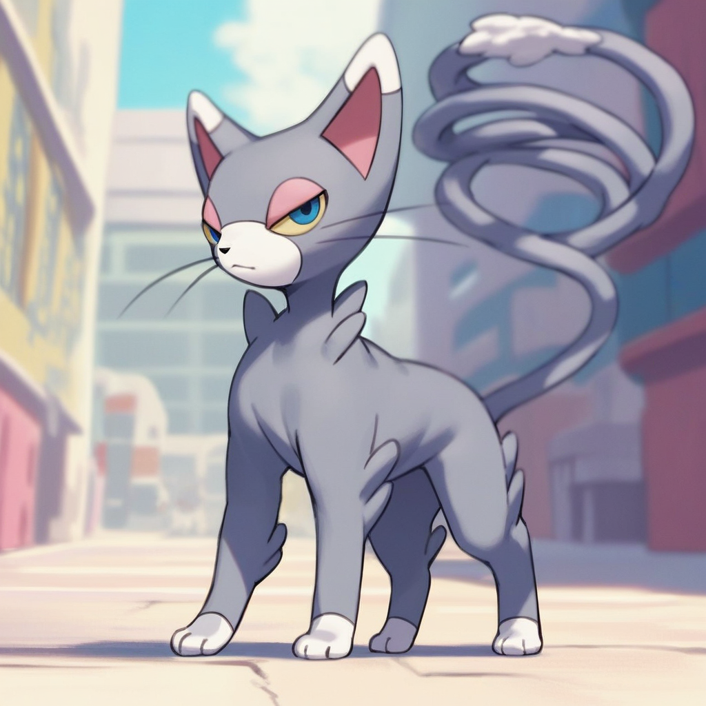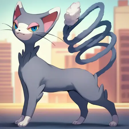 Cat, pokemon, gray and white fur, black nose, pink eyelids, blue eyes, yellow sclera, whiskers,