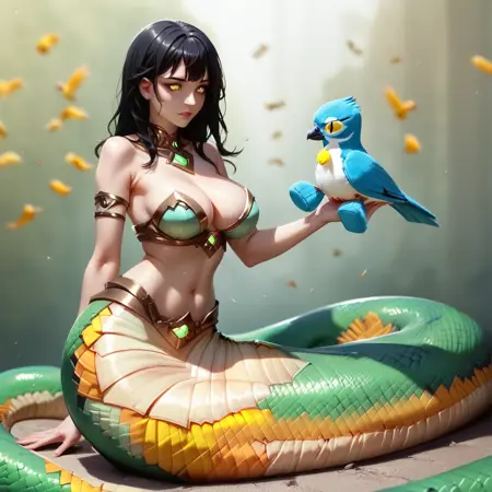 プロンプト: 1boy, 1girl, alien, animal, armlet, artistic background, badass, black ,bling ,blonde ,blue, blush, box, breasts, brown bun, bunch by chain, Christmas, cleavage, close-up, closed cloud, collarbone, colored couch, crown, curly curtains, dark ,dark-skinned, day, decked dress, earrings, eyes, yellow slit pupils, red slit pupils, green slit pupils, face focus, facial fancy fangs, female, fingernails, fireplace flowing focus, forked gem, gift, girl, glowing, goddess gold, golden green hair, grey hair, grin, hair, headdress horns, humanoid snake girl, in indoors, intricate, jewelry, lamia, landscape. large lights, lips, lipstick, long, looking lush, makeup, male, medium mole, monochrome, monster mouth, mystical, necklace, no nose, ocean, of open orange ornament, ornaments, out, outdoors, pale parted, paw pillar, plant, portrait, pose, slit pupils, realistic, red ribbon, robe, scales, sclera, serpents. sharp short shoulders, simple single sitting, skin, sky, sleeveless, slit smile, snake, solo, star stuffed stunning, surrounded tattoo, teddy teeth, tentacle, tentacles, tongue, topless toy, tree, upper viewer, water, web, white window,