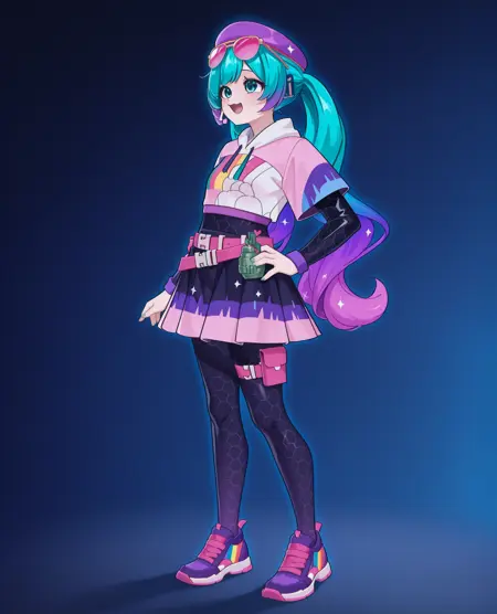 パープルのベレー帽、長い髪、複数色の髪、グラデーション髪、ツインテール、ヘッドセット、サングラス、ピンク tinted サングラス、ヘッドウェアにサングラス、重ね着袖、短い外側の袖、パープルのリストバンド、レインボー柄、短めのフーディ、お腹部分、服の下にボディスーツ、六角形柄、ドローコード、フード下り、ピンクのベルト、ベルトにグレネード、ポーチ、プリーツスカート、ダークパンティーホース、ダークパープルの太ももストラップ、パープルのスニーカー