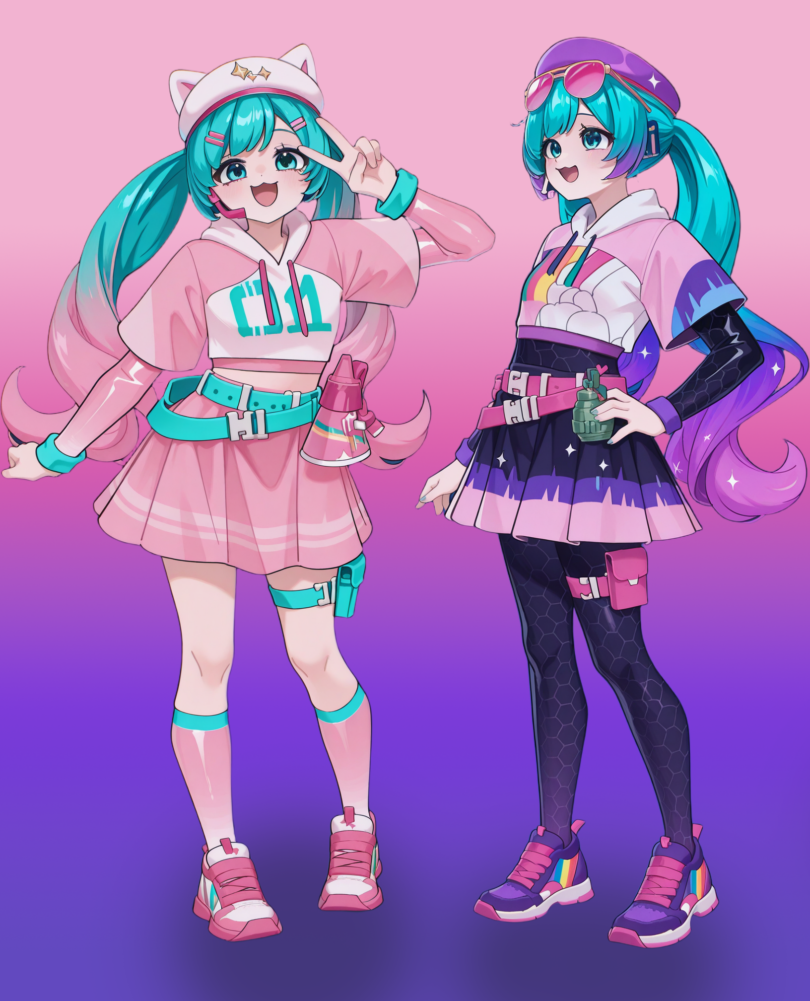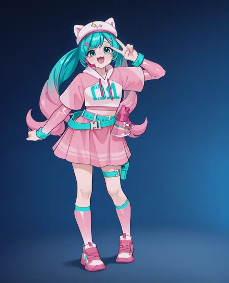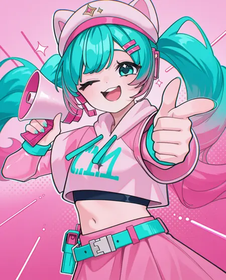 動物の耳ヘッドウェア、猫の帽子、長い髪、複数色の髪、グラデーション髪、ツインテール、ピンクのヘッドセット、髪留め付き重ね着袖、短い外側の袖、ピンクの袖、短めのフーディ、アクア色のショートシャツ、アクア色の服のプリント、ドローコード、フード下り、お腹部分、アクア色のリストバンド、アクア色のベルト、ベルトにメガホン、ピンクのスカート