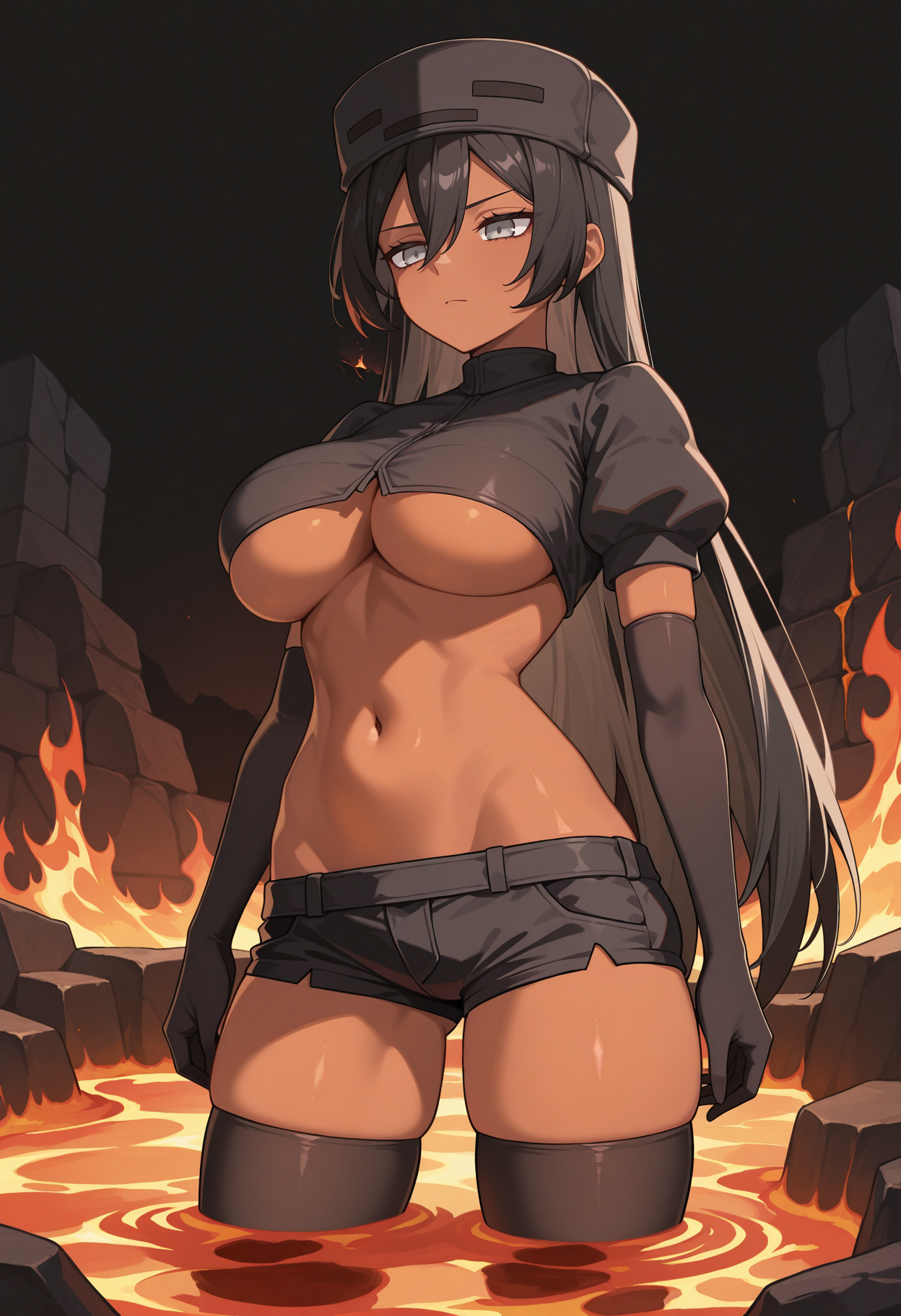 mtwrskl, 검은 피부의 여자, 회색 눈, 검은 머리카락, 눈 사이의 머리카락, 매우 긴 머리카락, 검은 머리장식, 크롭탑, 큰 가슴, 언더북, 검은 셔츠, 검은 장갑, 팔꿈치 장갑, 검은 반바지, 짧은 반바지, 낮은 다리 반바지, 검은 허벅지 양말, 배꼽, 허리, 키 큰 여자