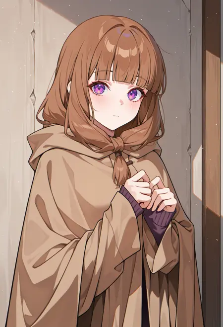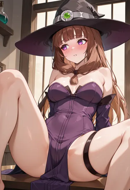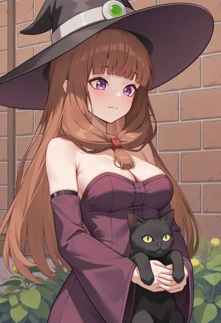 mtwtch,紫色眼睛,棕色头发,长发,前额辫子,单辫,齐刘海,女巫帽,黑色帽子,紫色连衣裙,裸露肩膀,无吊带,乳房,可拆卸袖子