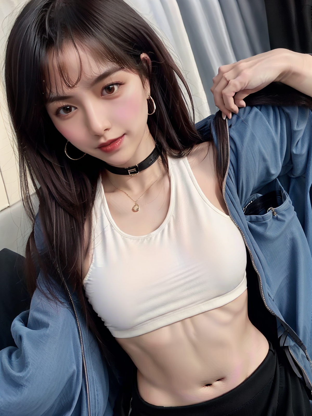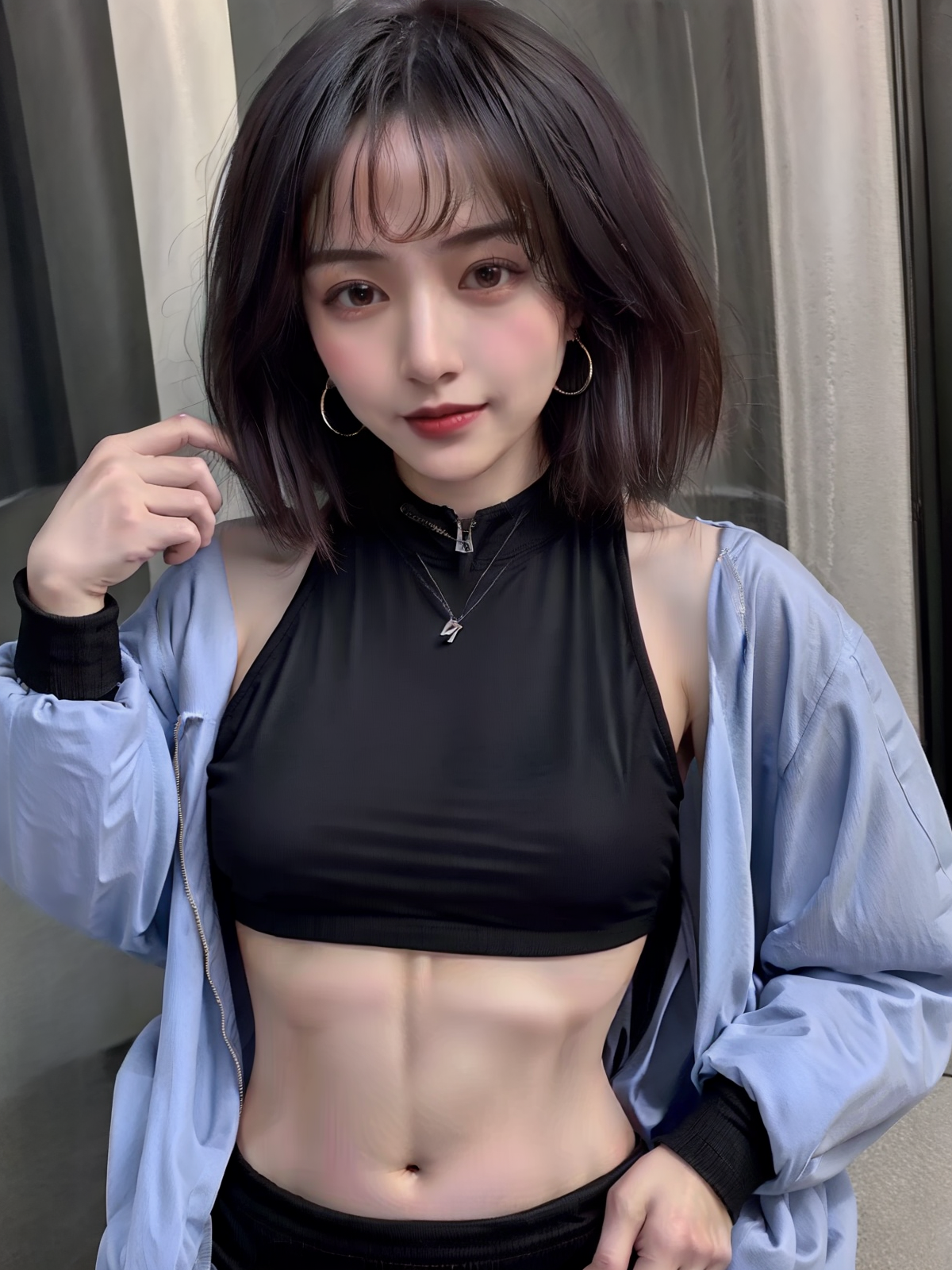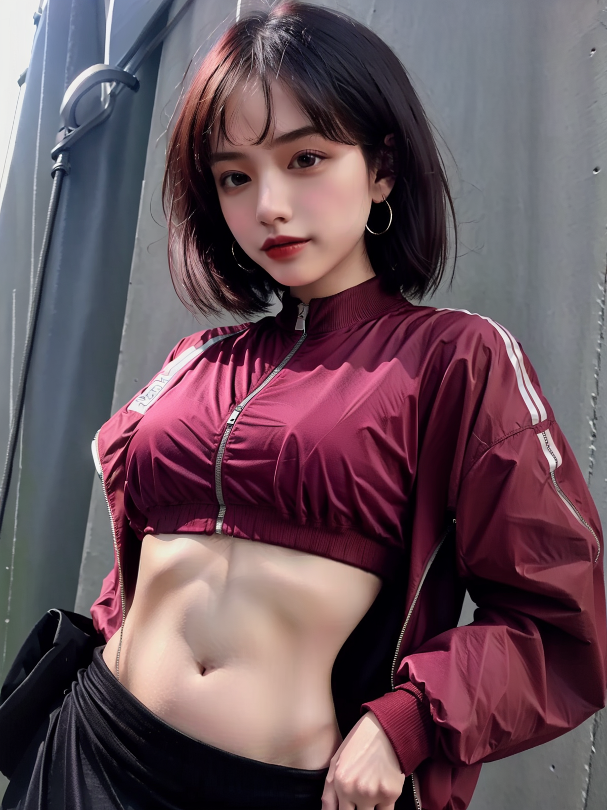 - 1girl, medium hair, crop top, jacket, navel, skirt, mature female, looking at viewer, muscular female,