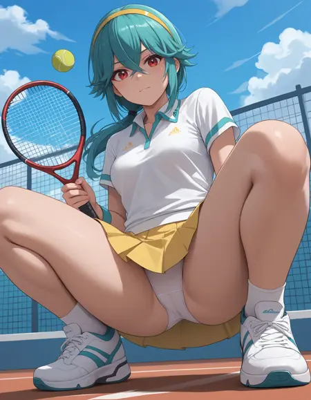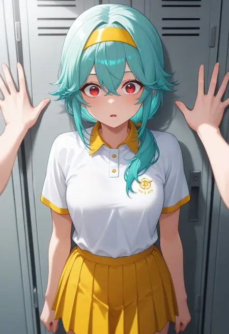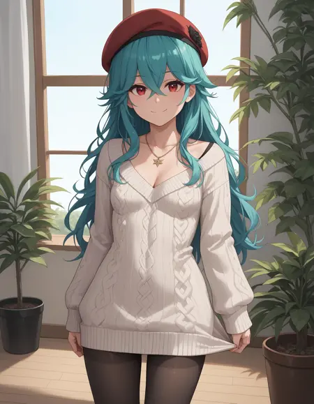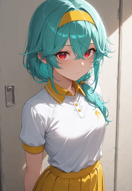 hair between eyes, yamadaptd, long hair, red eyes, small breasts, aqua hair