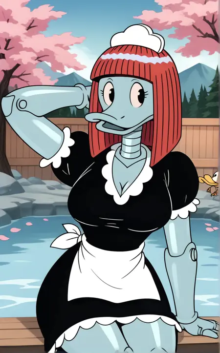 MAIN_Robotica_ownwaifu, 1girl, android, beak, furry female, metal skin, no humans, robot girl, robot joints, straight hair, black eyes, colored skin, red hair, long hair, black dress, maid headdress, maid apron, enmaided, puffy sleeves, white apron, waist apron, doll joints, puffy short sleeves, hat, blunt bangs, frills, long nose, short sleeves, 1other, breasts, large breasts, cleavage, frilled apron, maid, short dress, duck, mechanical arms, bob cut, blue skin, frilled sleeves, white headwear, mecha, blunt ends,