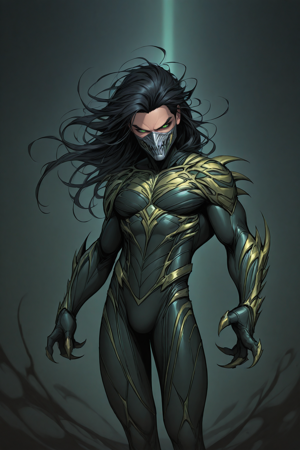 트리거 추가 Darkness: 1boy, 성숙한, 남자, (darkness), 검은 머리, 은색 마스크, 검은 녹색 노랑색 공생체 갑옷, 돌기, 발톱, 녹색 노랑색 눈