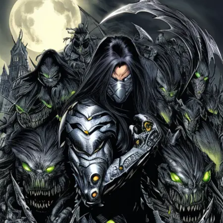 추가 트리거 Darkness: darkness, 검은 머리, 노란색으로 빛나는 눈, 은색 마스크를 쓰고 검은색, 노란색, 녹색 갑옷을 입은 남성, 금속성 부속물과 날카로운 돌기, 그리고 수많은 괴물들