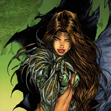 추가 트리거 Witchblade: witchblade, 갈색 머리의 세ク시한 몸매를 가진 여성, 녹색, 노란색, 검은색 갑옷을 입고 있으며, 날카로운 돌기와 금속성 부속물이 달려 있음