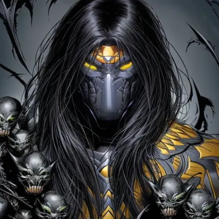 额外触发词:黑暗 —— 黑色头发、黄色发光眼睛、佩戴银色面具的男子,身穿黑色、黄色、绿色带金属触须和尖刺的盔甲,并伴随一群怪物