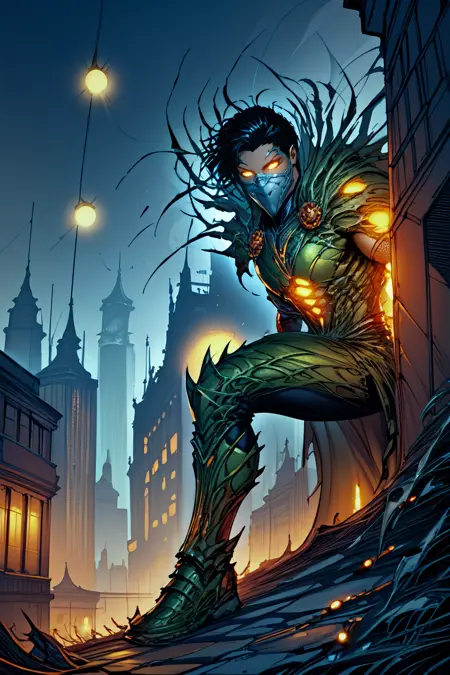 ダークネス用追加トリガー:1boy, mature, a man, (darkness), 黒い髪, 銀色のマスク, 黒・緑・黄のシンビオート装甲, 尖り, 爪, 緑・黄の目