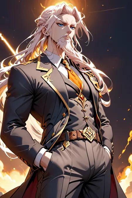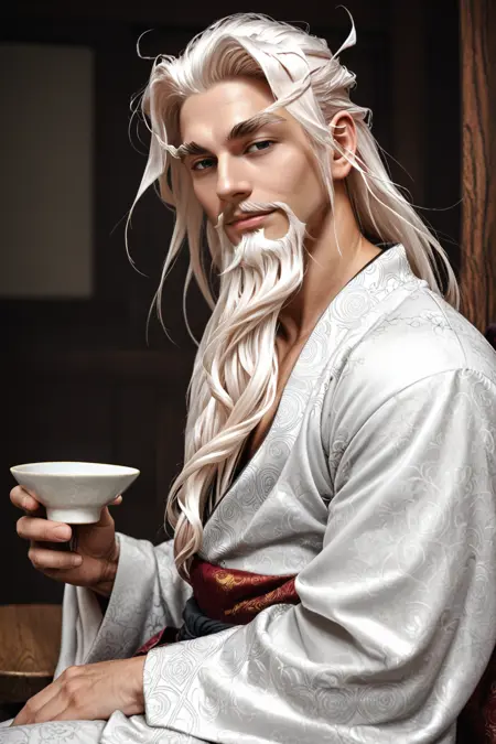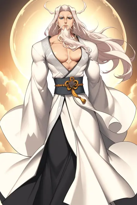 着物のトリガー:jitiandao、長い髪、濃い眉、白髪、顔の毛、ひげ、口ひげ、年老いた、着物、長い袖、広い袖、成熟した男性、筋肉質な男性、胸の谷間