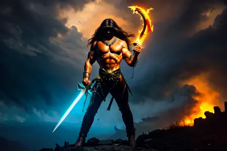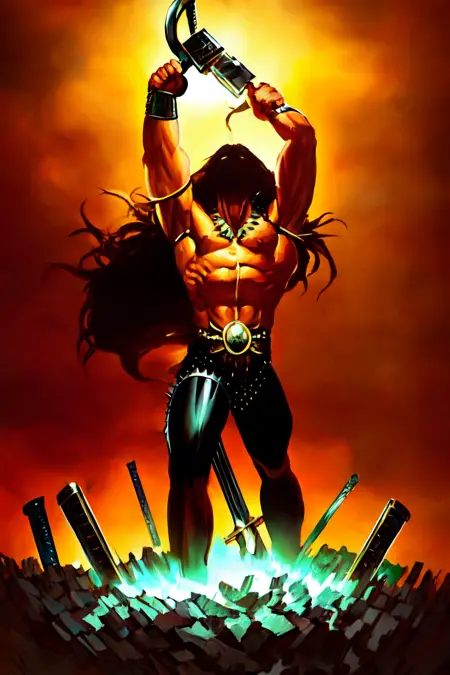 사용할 트리거 단어 예시: 근육질, 발광, 체인, 상반신 노출된 남성, 두개골, 해머, 번개, 불, 무기, 복근, 발광하는 눈, 스파이크, 소녀, 검, 레트로 아트 스타일, 피, 도끼, 죽음, 악마, 시체, 보석, 목걸이, 무기 들고 있음, 창, 말 타기, 말등타기, 바위, 용암, 들고 있음, 양손 무기, 여러 명의 소녀, 벌거벗은, 여러 명의 남성, 날개, 팔찌, 몬스터 소녀, 뱀, 판타지, 드래곤, 해머, 번개, 시체, 채찍, 박혀 있는, 박혀 있는 검, 망치, 꼬리, 뿔, 날카로운 귀, 갑옷, 팔을 위로 치켜든, 데몬걸, 창, 천사, 마법