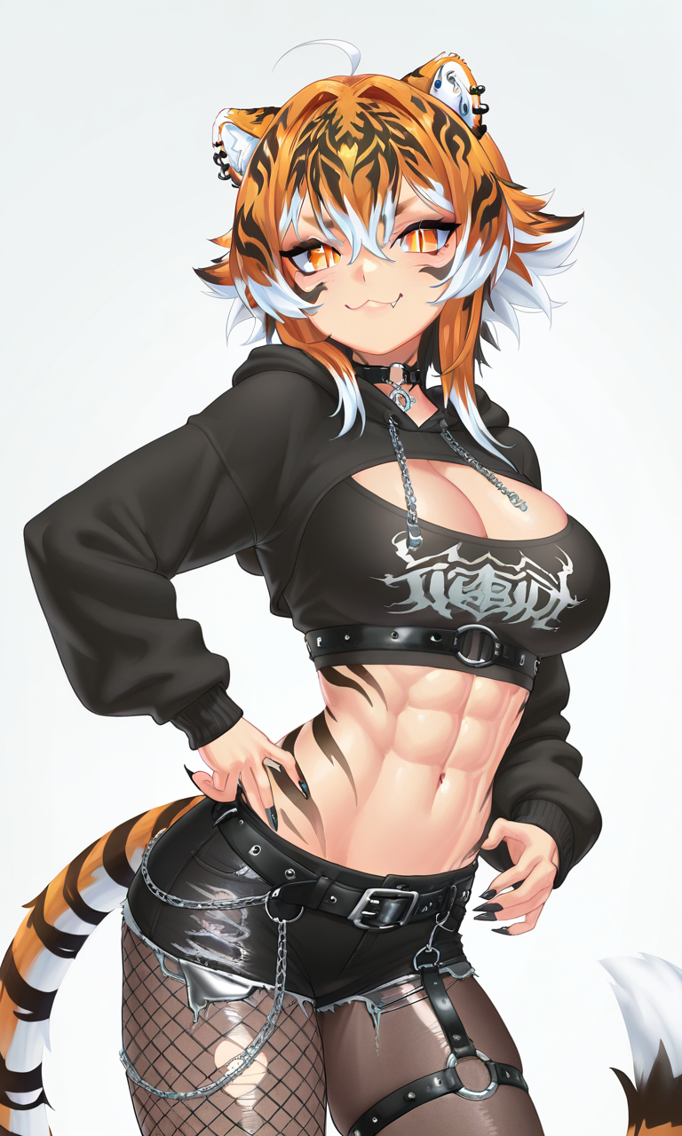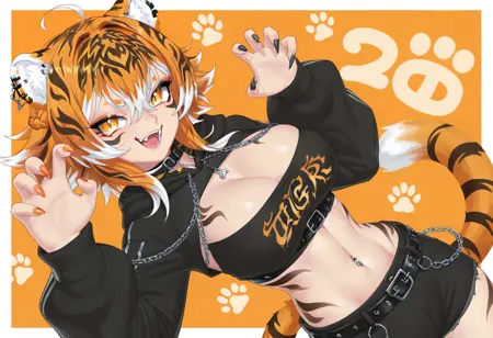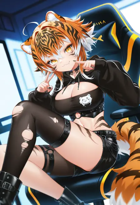 | 학습된 단어 | TaigaVS, 1girl, solo, looking at viewer, short hair, large breasts, black hair, long sleeves, thighhighs, navel, animal ears, hair between eyes, closed mouth, cleavage, tail, full body, white hair, ahoge, multicolored hair, pantyhose, boots, shorts, choker, medium hair, belt, black thighhighs, midriff, hood, black footwear, nail polish, orange hair, streaked hair, collar, animal ear fluff, crop top, fingernails, black pantyhose, orange eyes, torn clothes, short shorts, thigh strap, hoodie, tattoo, black choker, black shorts, fangs, piercing, facial mark, black nails, slit pupils, animal print, single thighhigh, o-ring, black belt, torn pantyhose, sharp fingernails, shrug (clothing), straight-on, tube top, tiger ears, whisker markings, torn thighhighs, tiger print, micro shorts, tiger tail, body markings, bustier, tiger girl, animal feet, year of the tiger, orange fur, tiger stripes복사됨! |