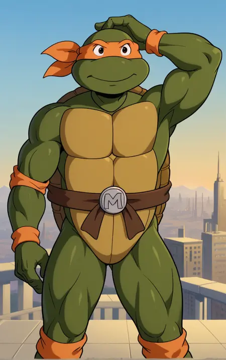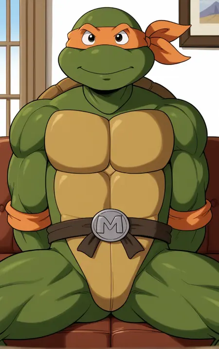 CARTOON_TMNT1987_Michelangelo_ownwaifu, 1other, bald, eye mask, furry male, green skin, orange mask, orange wristband, turtle shell, bandana, black eyes, no humans, belt, muscular, colored skin, wristband, pectorals, armor, muscular male, bodysuit, buckle, abs, belt buckle, large pectorals,