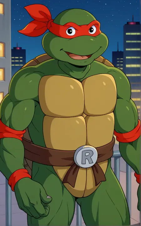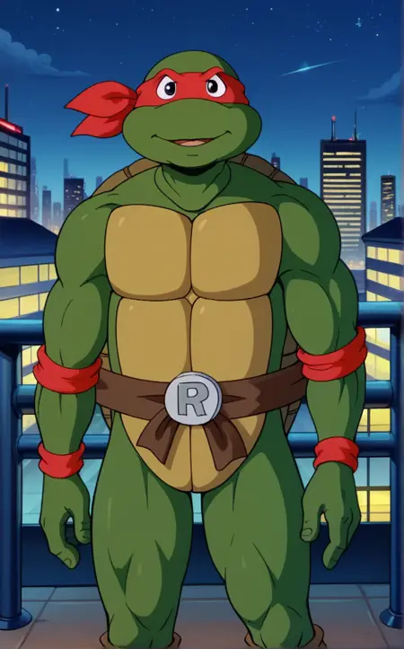 Genderswap_mtf_Raphael_ownwaifu, 1girl, genderswap \(mtf\), green skin, black eyes, colored skin, bandages, breasts, belt, turtle shell, eye mask, red mask, red bandana, red wristband, bodysuit, no humans, furry female, large breasts, bald, weapon,