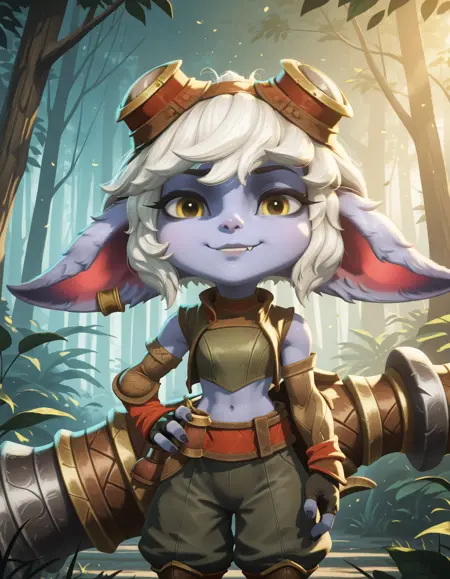 デフォルトの衣装: 1girl, solo, tristana_lol, furry, yordle, 白髪, 青い毛皮, 尖った歯, 色付きの肌, 尖った耳, ピアス, 黄色い目, ショートトップ, 腕当て, バギーパンツ, 頭にゴーグル, フィンガーレスグローブ,