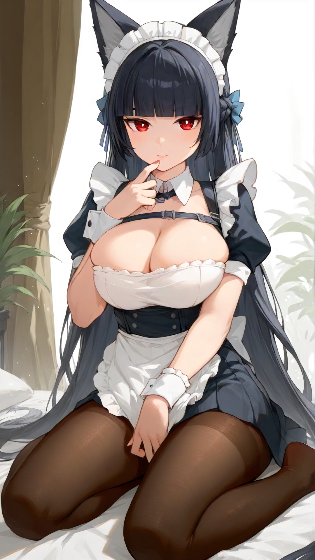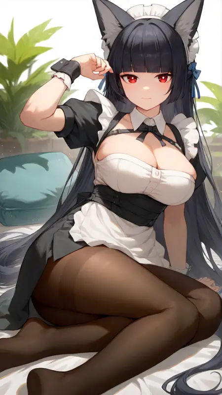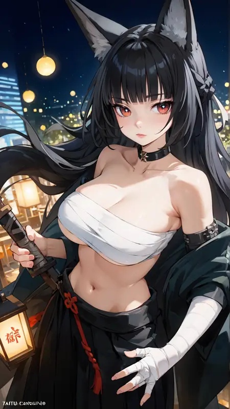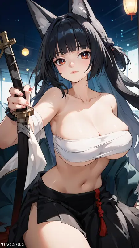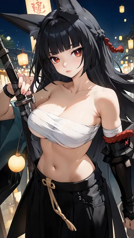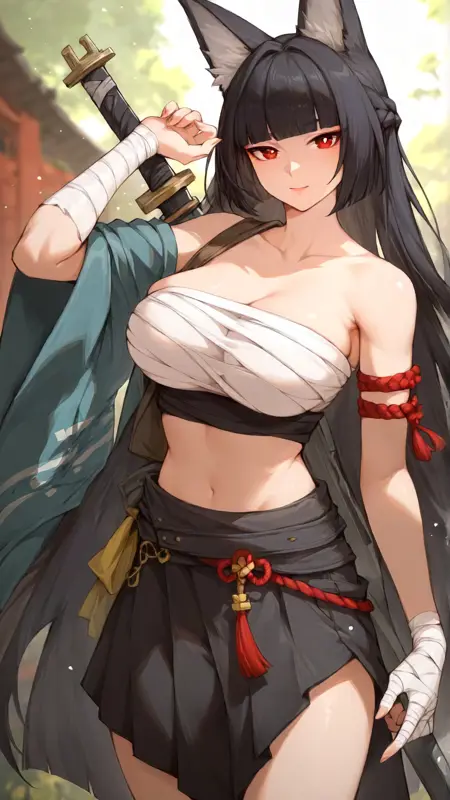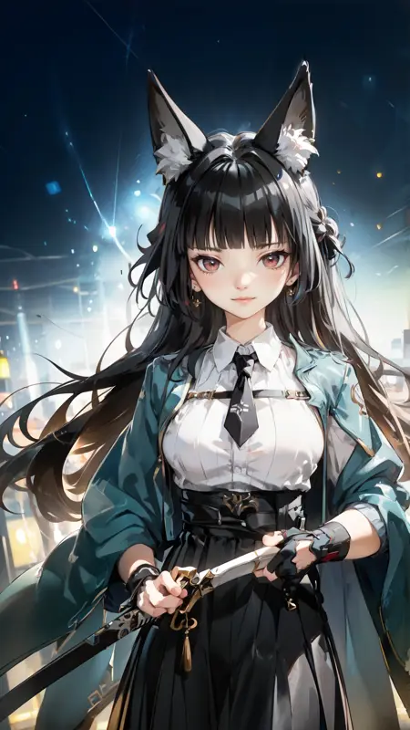 例のプロンプト: "hoshimi_miyabi, an anime girl, 1girl, solo, long hair, breasts, looking at viewer, bangs, skirt, simple background, shirt, black hair, red eyes, gloves, long sleeves, white background, holding, animal ears, medium breasts, closed mouth, jacket, white shirt, weapon, cowboy shot, necktie, black gloves, collared shirt, sword, blunt bangs, fingerless gloves, black skirt, holding weapon, animal ear fluff, holding sword, sheath, black necktie, high-waist skirt, unsheathing"