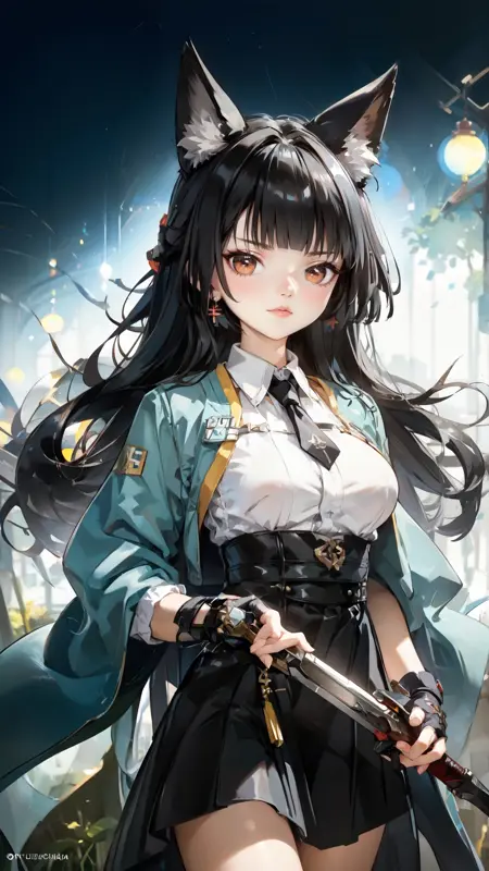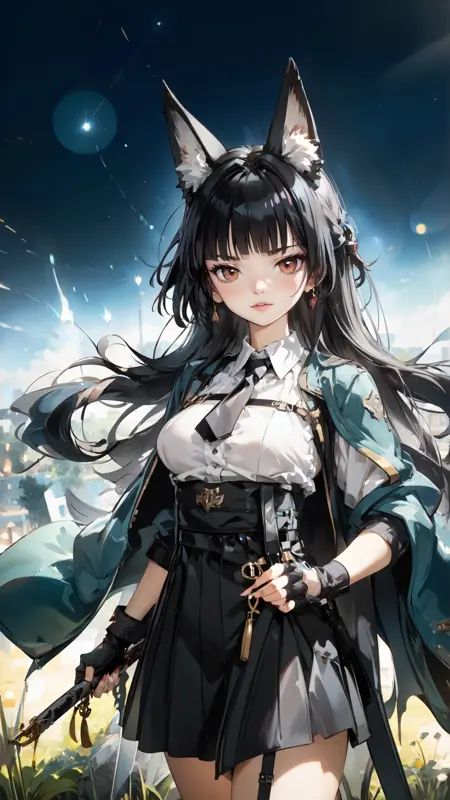 예시 프롬프트: "hoshimi_miyabi, an anime girl, 1girl, solo, long hair, breasts, looking at viewer, bangs, skirt, simple background, shirt, black hair, red eyes, gloves, long sleeves, white background, holding, animal ears, medium breasts, closed mouth, jacket, white shirt, weapon, cowboy shot, necktie, black gloves, collared shirt, sword, blunt bangs, fingerless gloves, black skirt, holding weapon, animal ear fluff, holding sword, sheath, black necktie, high-waist skirt, unsheathing"
