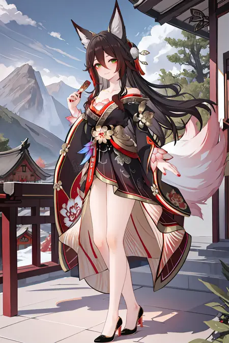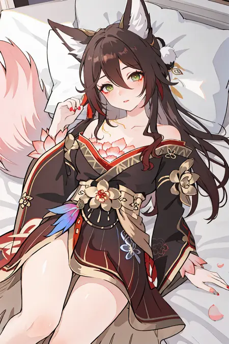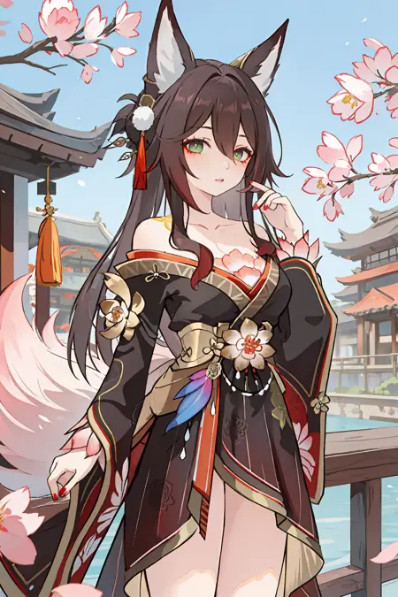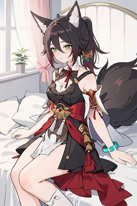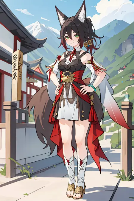 Tingyun 默认服装的附加提示:马尾辫、尾巴、中国发簪、腰带、颈带、无袖连衣裙、可拆卸袖子、手镯、露趾靴