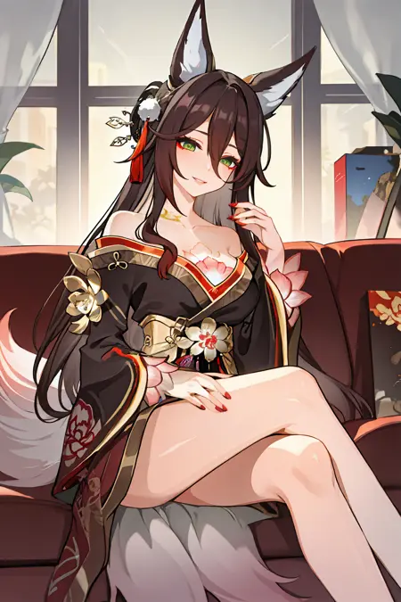 Fugue 默认服装的附加提示:发饰、半盘发、粉色尾巴、红色指甲、花卉图案汉服、黑色高跟鞋、肩部纹身