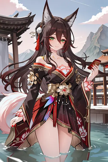 Tingyun 默认服装的附加提示:马尾辫、尾巴、中国发簪、腰带、颈带、无袖连衣裙、可拆卸袖子、手镯、露趾靴