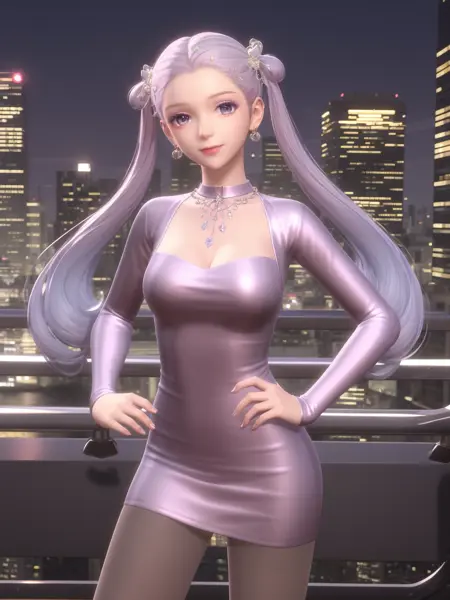 - SYNNzidingyi01, 1girl, solo, jewelry, purple eyes, dress, twintails, earrings, long hair, pantyhose, necklace, hair ornament, looking at viewer, cityscape, night,