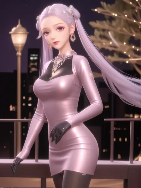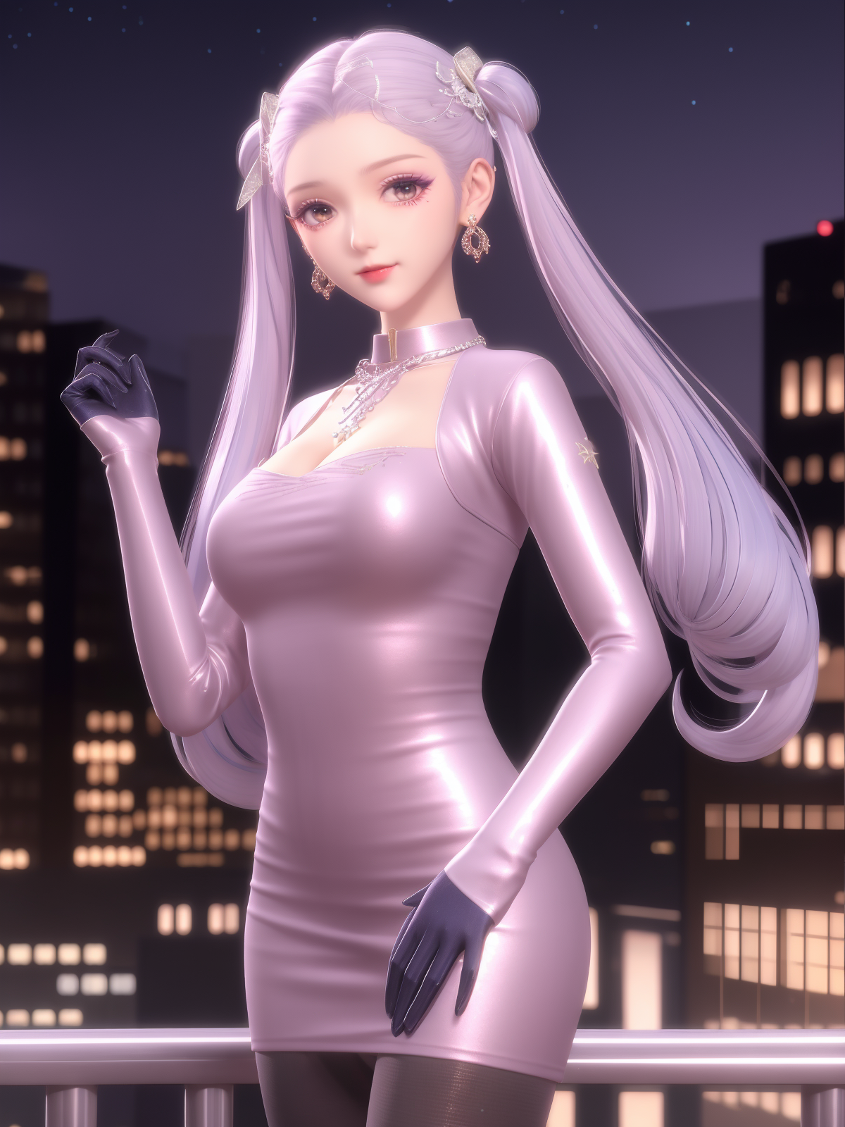 • SYNNzidingyi01, 1girl, solo, jewelry, purple eyes, dress, twintails, earrings, long hair, pantyhose, necklace, hair ornament, looking at viewer, cityscape, night,