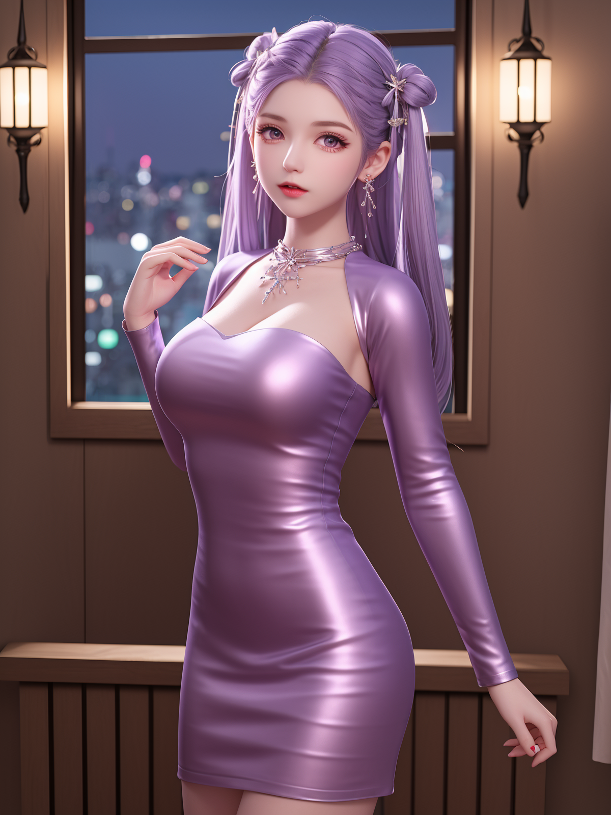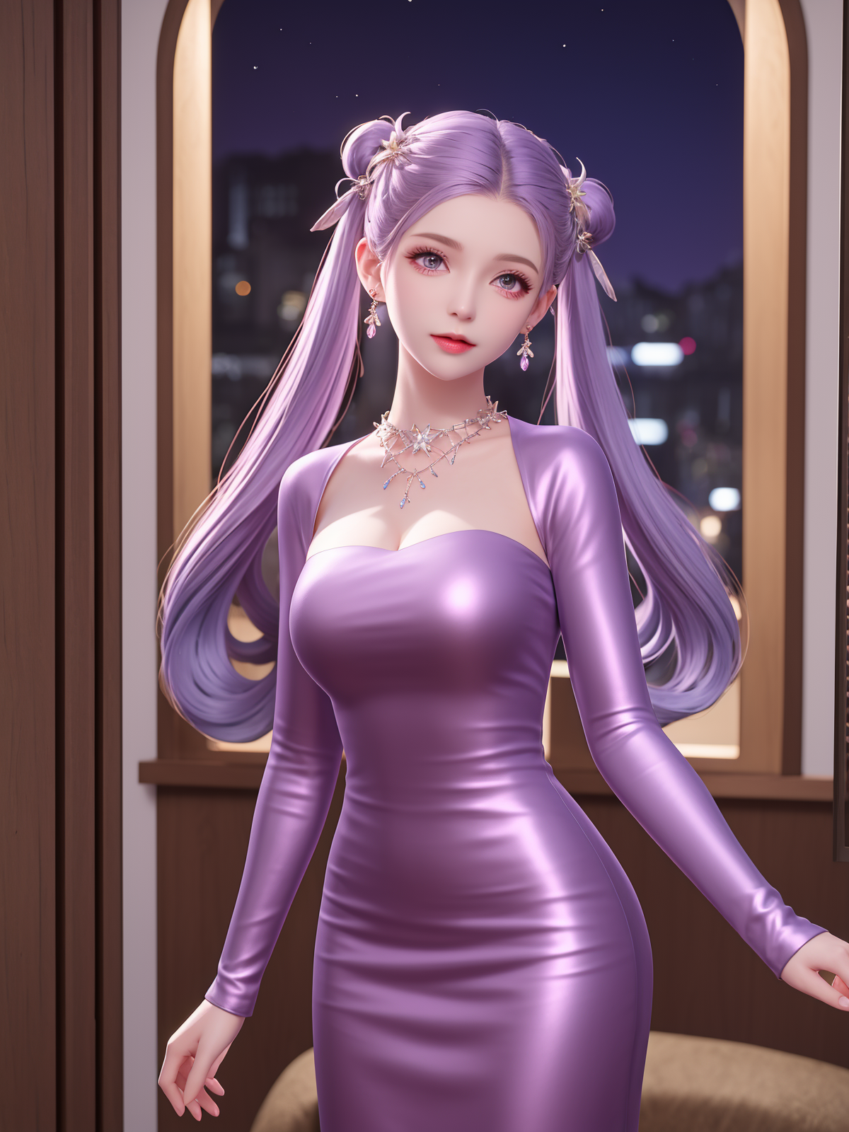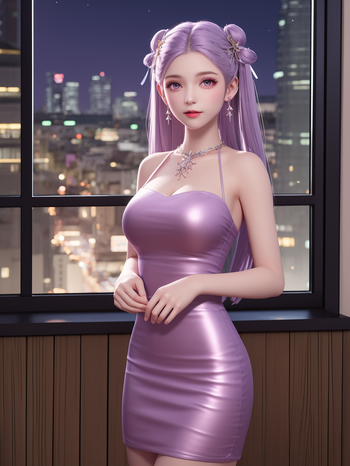 - SYNNzidingyi01, 1girl, solo, jewelry, purple eyes, dress, twintails, earrings, long hair, pantyhose, necklace, hair ornament, looking at viewer, cityscape, night,