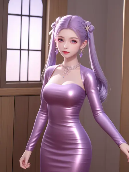 - SYNNzidingyi01, 1girl, solo, jewelry, purple eyes, dress, twintails, earrings, long hair, pantyhose, necklace, hair ornament, looking at viewer, cityscape, night,