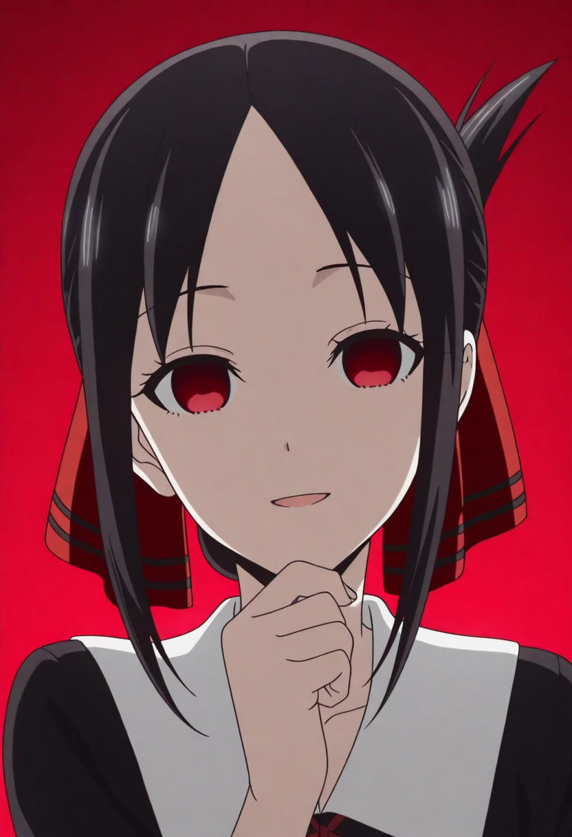 1girl, shinomiya kaguya, solo, black hair, red eyes, ribbon, hair ribbon, folded ponytail,