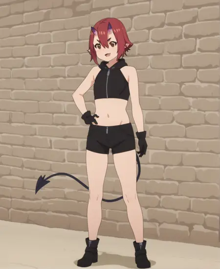 | 训练词汇 | Youki, 1girl, solo, horns, navel, red hair, pointy ears, hair between eyes, short hair, fang, tail, brown eyes, demon tail, brown hair, demon girl,已复制! gloves, black gloves, black footwear, midriff, shorts, crop top, black shorts, bare shoulders, sleeveless, zipper, boots, 已复制! |