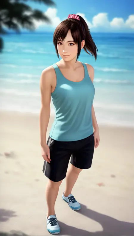 miiyamotohikari, realistic, 1girl, solo, black hair, bangs, ponytail, pink scrunchie, brown eyes, looking at viewer, cyan tank top, black wristband, black shorts, white sport shoes,