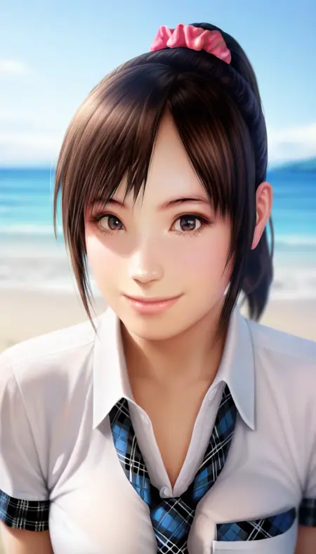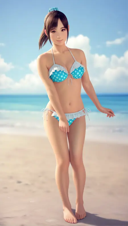 miiyamotohikari, realistic, 1girl, solo, black hair, ponytail, bangs, blue scrunchie, brown eyes, blue bikini with white trim, white ribbon, white flip-flops,