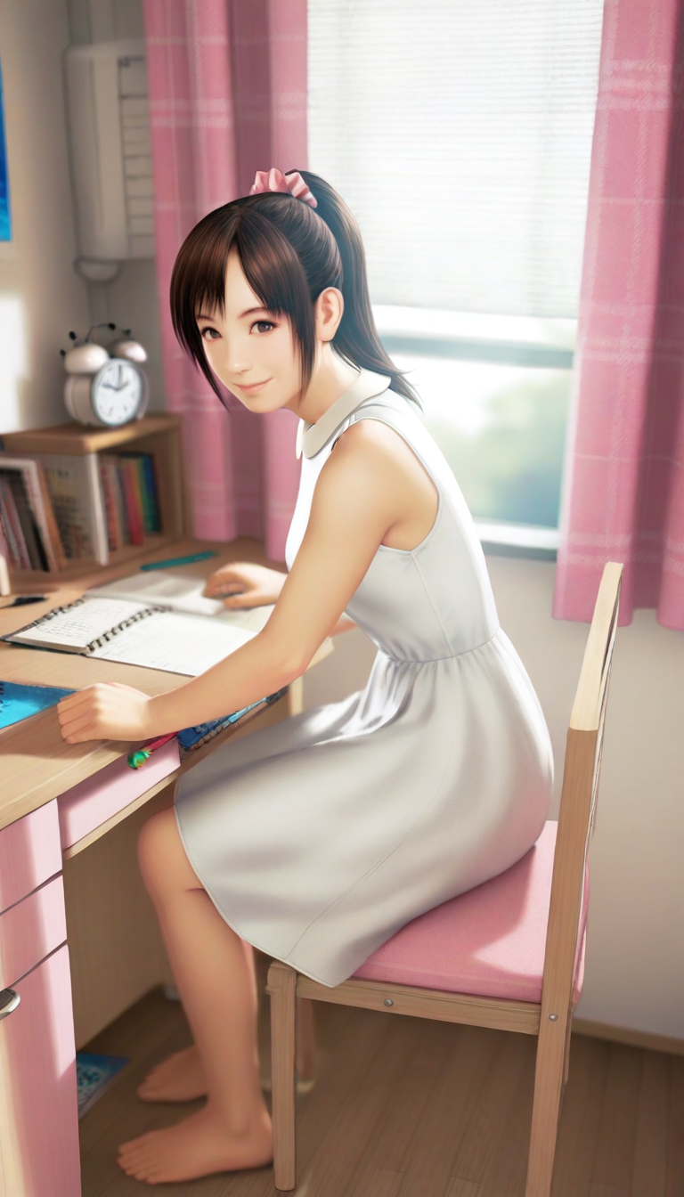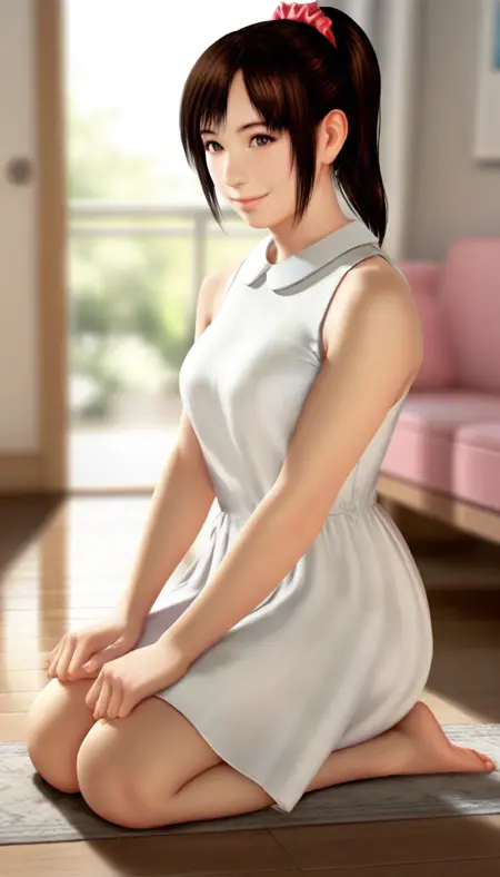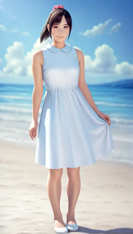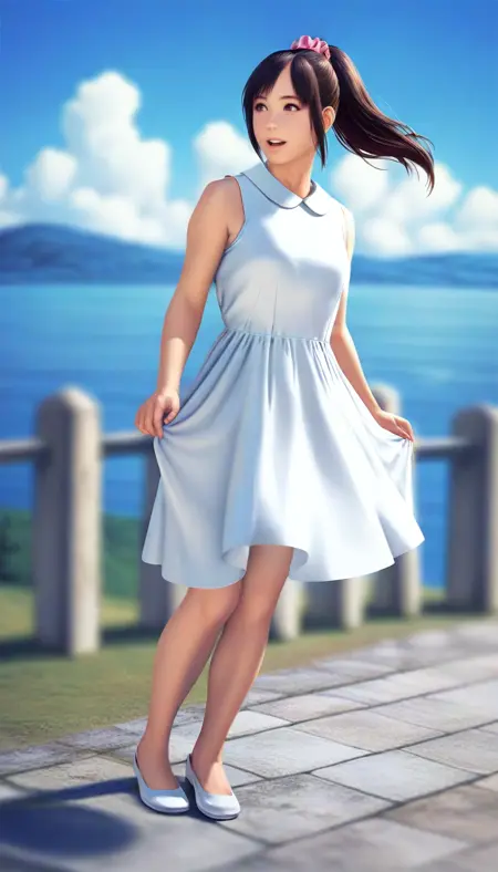 miiyamotohikari, realistsic, 1girl, solo, black hair, bangs, pink scrunchie, brown eyes, sleeveless white dress, white wristwatch, white flat shoes,