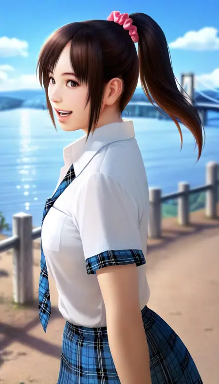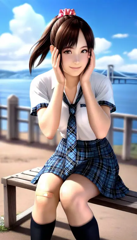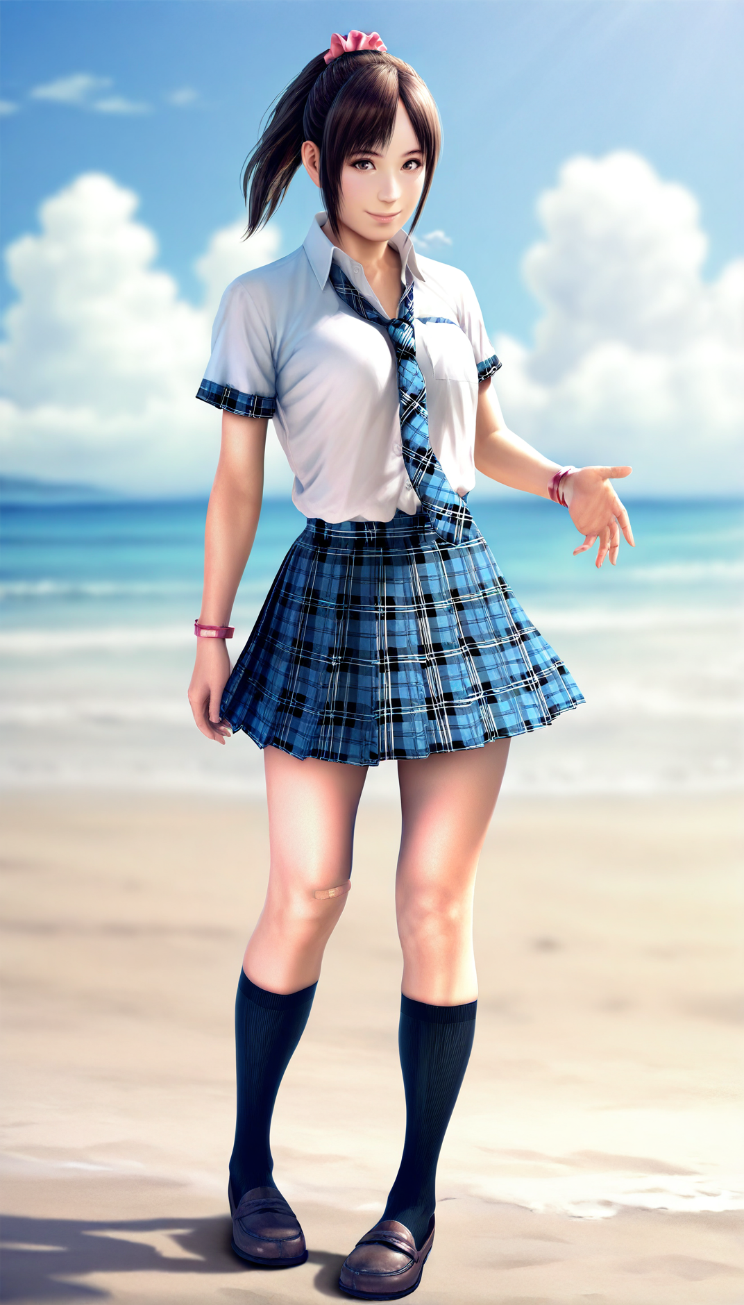 miiyamotohikari, realistic, 1girl, solo, black hair, bangs, pink scrunchie, brown eyes, white collar shirt, blue plaid skirt, blue plaid necktie, red wristband, black kneehighs, bandaid on knee, brown leather shoes,