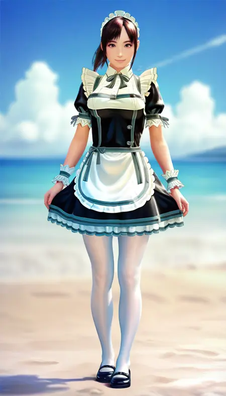 miiyamotohikari, realistic, 1girl, solo, black hair, bangs, brown eyes, black maid clothes, maid headdress, wrist cuffs, bowtie, black ribbon, white pantyhose, black flat shoes,