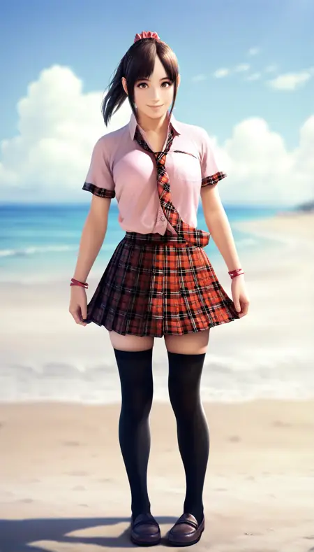 miiyamotohikari, realistic, 1girl, solo, black hair, bangs, black scrunchie, brown eyes, pink collar shirt, red plaid skirt, red plaid necktie, red wristband, black over the knee highs, brown leather shoes,